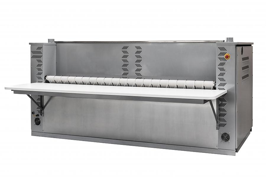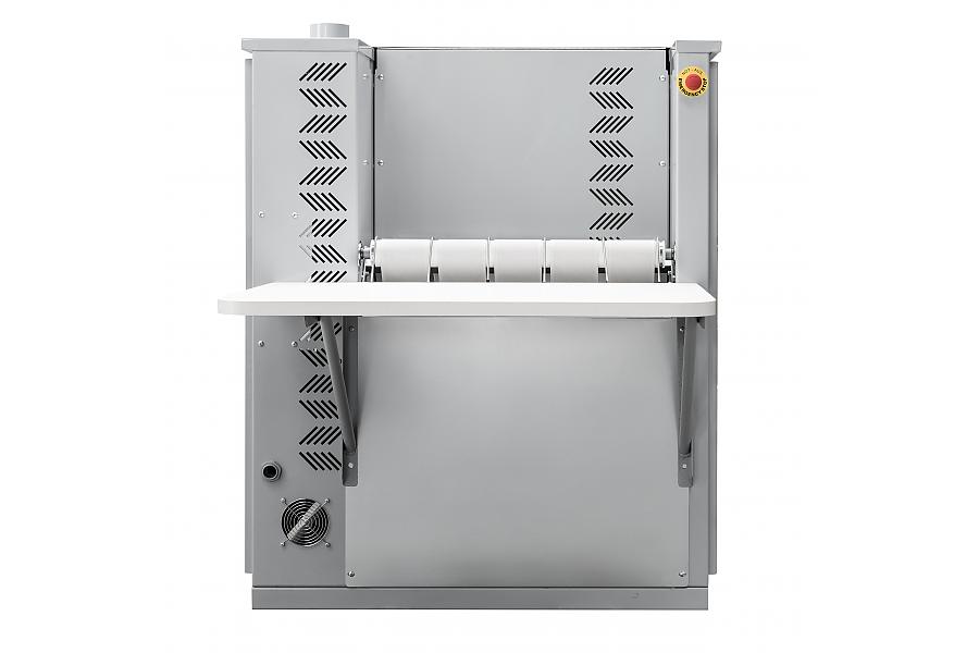 - sur demande, avec sortie linge des deux cotés: cette option est intéressante pour des blanchisseries avec plusieurs employées. Ces repasseuses peuvent être utilisées aussi d'une seule personne. Selon la nécessité, on peut après activer pas un seul bouton, la sortie postérieure, transportant le linge séché et repassé sur un tableau monté sur le coté postérieur, permettant de replier facilement sans que les différents opérateurs se gênent l’un l’autre.
