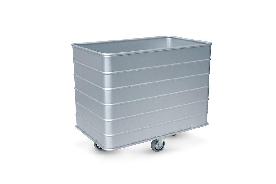 Carrello portabiancheria in argento. In metallo leggero anodizzato e con superfici anodizzate. Costole di rinforzo orizzontali circa ogni 120 mm. Disponibile con pareti e base perforate, diametro 12 mm.