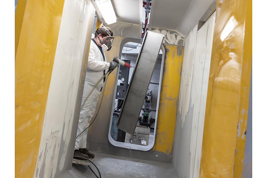 - einer Spritzkabine mit 4,96 × 0,7 × 1,70m (LxBxH)