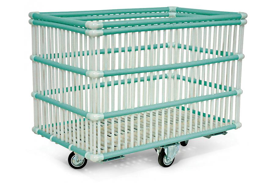 Wagen aus Polypropylenrohren. Hat ein stabiles Grundgestell aus verzinktem Stahl.